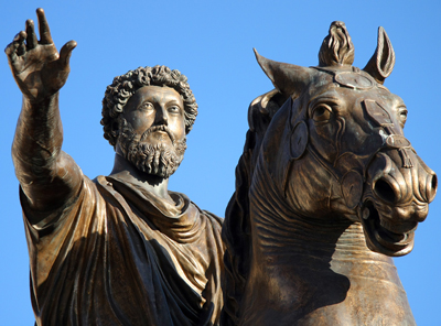 Tutte le strade portano a Roma. Confluiscono sotto questa statua equestre, in Campidoglio. La statua, una copia[1], è quella di Marco Aurelio, l’imperatore filosofo sotto il cui regno, tra il 161 e il 180, l’impero romano toccò il suo apogeo. Tutte le strade conducono qui, a